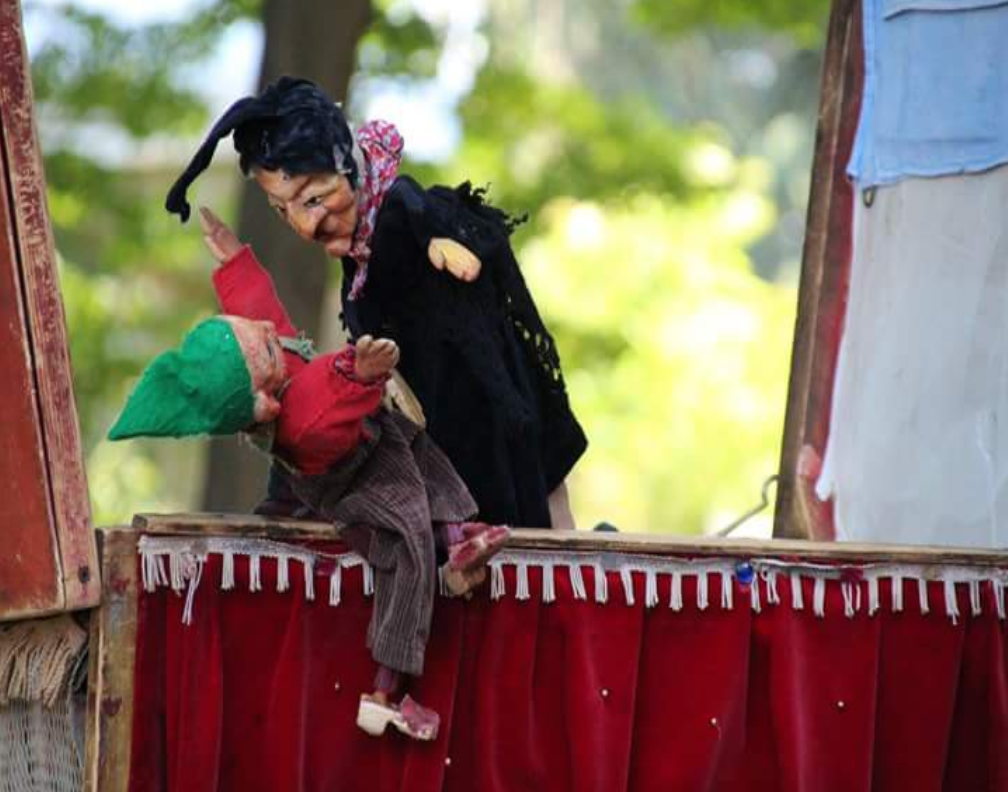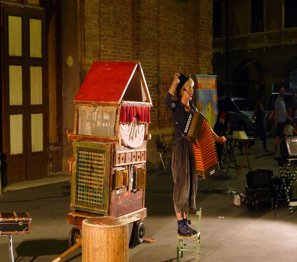 Un ottocentesco castelletto di burattini su ruote che arriva nei centri storici, nei parchi, nelle piazze, nelle scuole, nei cortili; senza esigenze tecniche perché completo di impianto a batterie burattini e burattinaio posti a sedere e podio per esibirsi , una piccola orchestra il giocoliere fantasista, l’affabulatore il cantastorie e clown.
