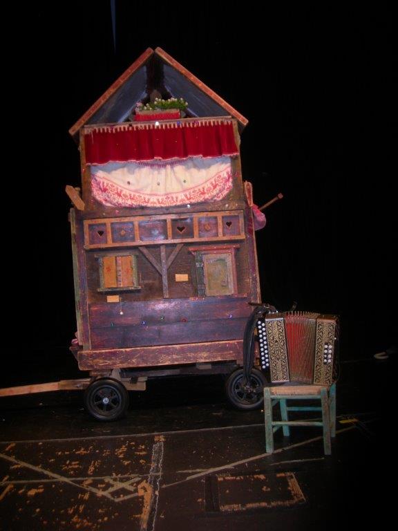 Lo spettacolo si sviluppa intorno ad una strana baracca di burattini su ruote con un grosso mulino a vento sulla facciata: ”la casa degli gnomi“ e alla contastorie che ci gira intorno e fa’ da tramite col pubblico.