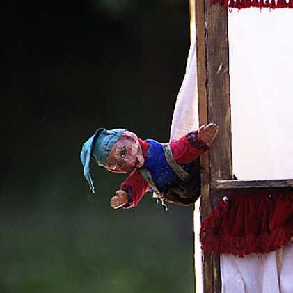 Ecco la capacità di Lucia di farsi piccola, piccola – che è poi la straordinaria dote che le consente di entrare in perfetta sintonia con il pubblico dei bambini – per entrare materialmente nel mondo degli gnomi, facendosi un tutt’uno con i suoi pupazzi.